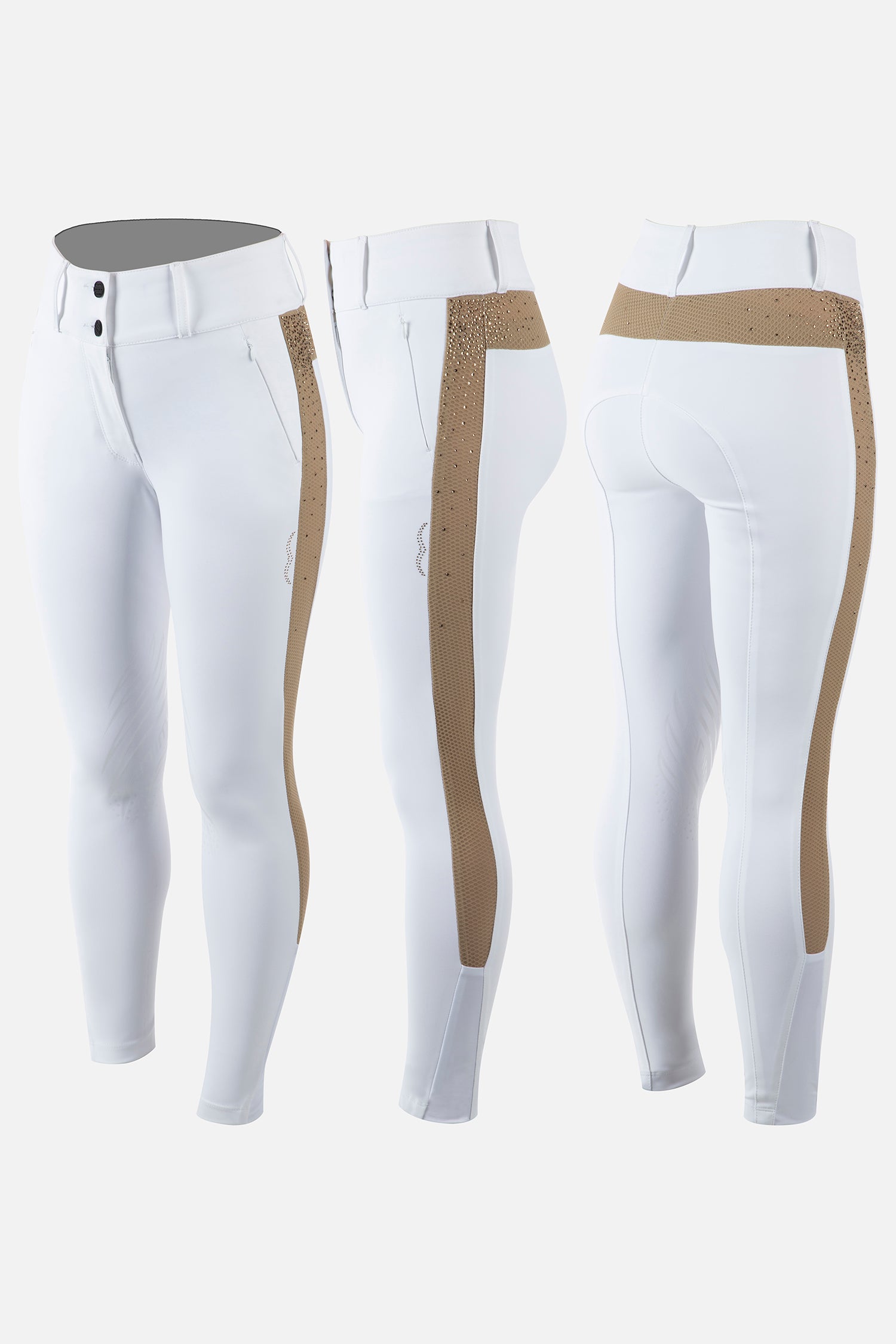 These breeches come in knee grip providing excellent stability while riding. The waistband features dual-position belt loops, and an inner silicone strip keeps your shirt in place. The ankles are detailed with jersey for flexibility, while rhinestone inserts add a touch of sophistication to the sides and back yoke.
