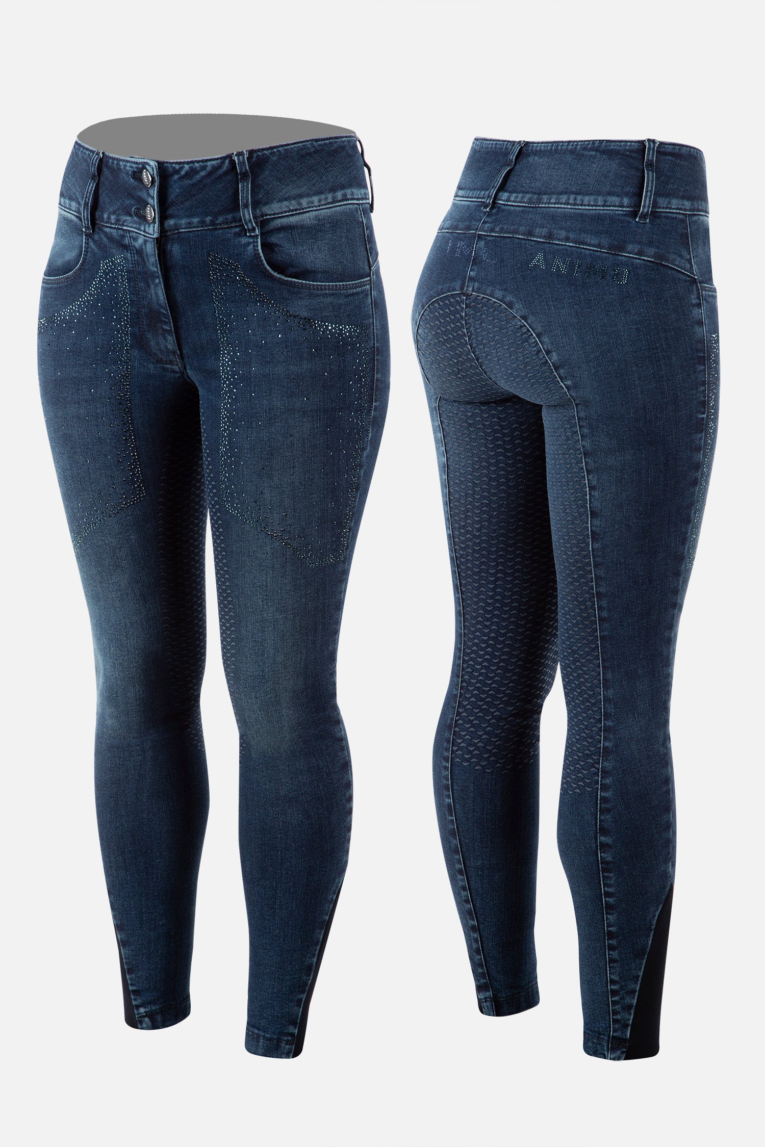 The Animo Norway Full Seat, High Waisted Jean breeches are a sparkling example of Animo craftsmanship. Featuring stunning rhinestone details across the front and back of the garment, they are for riders wanting to stand out a little more!