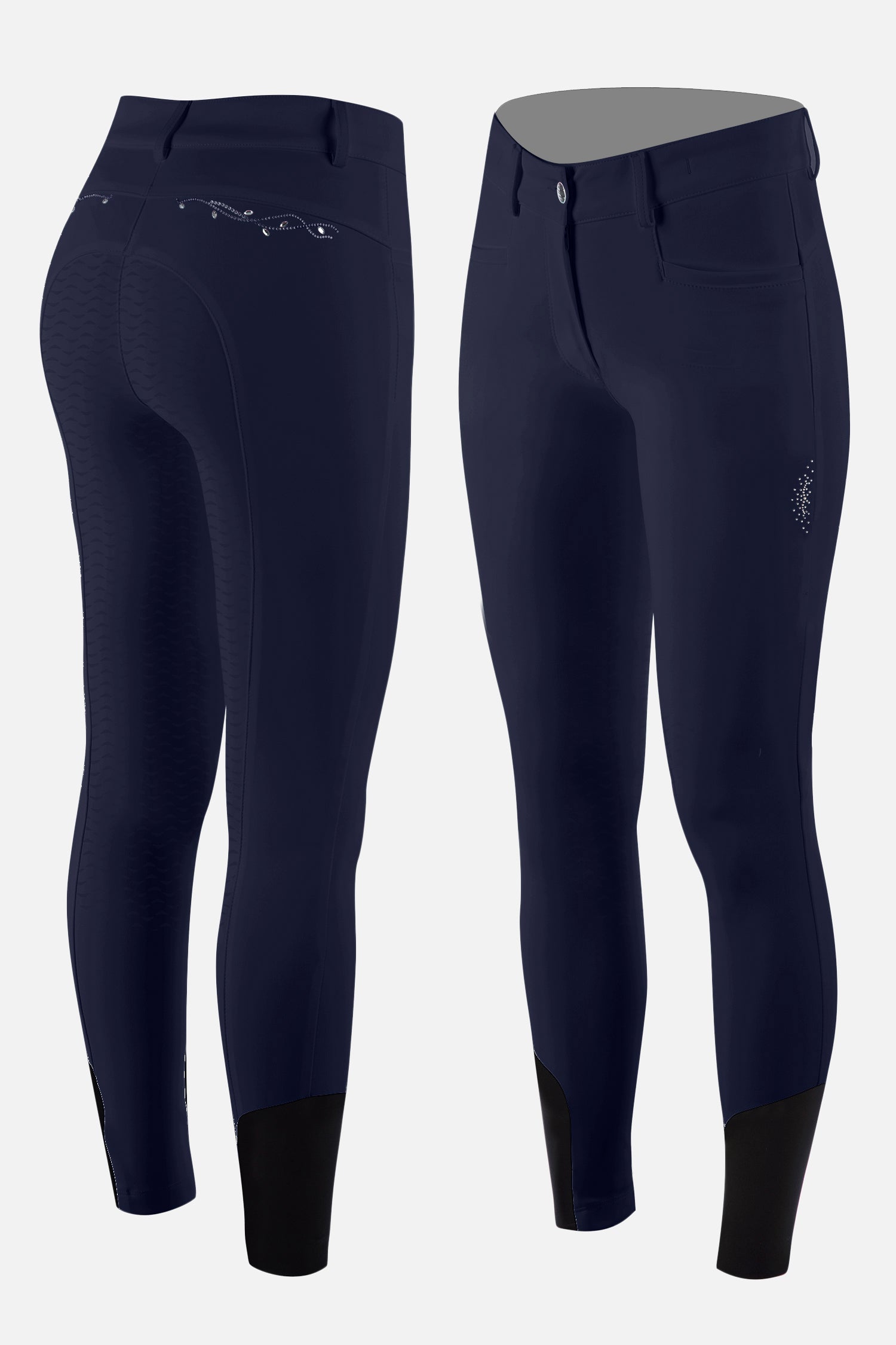 Beautifully adorned with a striking motif and sparkling crystal details, these breeches combine style and performance. Please note these breeches are knee grip only.