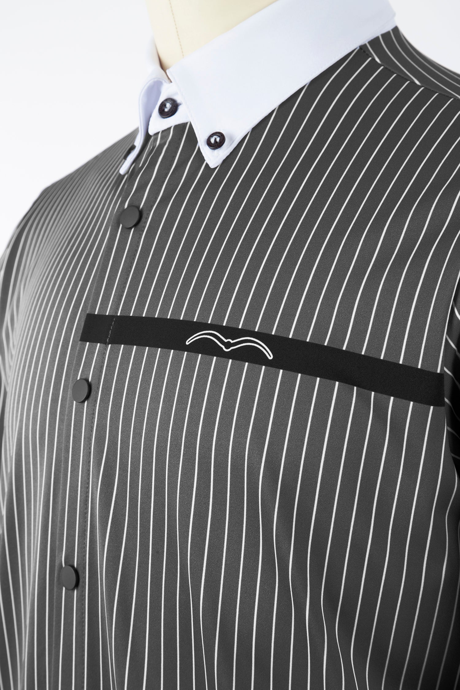 This shirt has the necessary stretch, breathability, and antibacterial qualities with a classic appeal. Complete with rubber black snap buttons, a white collar and cuffs, and the iconic logo, it exudes a sleek and athletic style.